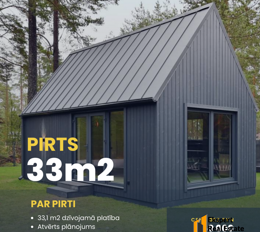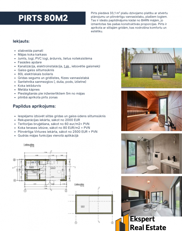 Pirts piedāvā 33,1 m² plašu dzīvojamo platību ar atvērtu plānojumu un pilnvērtīgu vannasistabu, plašiem logiem. Tas ir ideāls papildinājums kādai no BARN mājām, jo izmantotas tās pašas konstruktīvās proporcijas. Pirts ir aprīkota ar siltajām grīdām, kas nodrošina komfortu un estētiku
